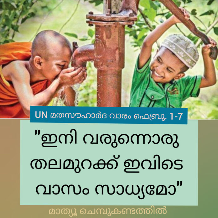 “യുഎൻ മതസൗഹാർദ്ദവാരമായി ഫെബ്രുവരി 1 മുതൽ 7″ വരെ ആചരിക്കുന്ന വാർത്ത കേട്ടപ്പോർ മനസിൽ ഓടിയെത്തിയത് ഇഞ്ചക്കാട് ബാലചന്ദ്രൻ്റെ ”ഇനിവരുന്നൊരു തലമുറയ്ക്ക് ഇവിടെ വാസം സാധ്യമോ?” എന്ന കവിതയായിരുന്നു. ഈ മഹാപ്രപഞ്ചത്തിലെ പച്ചത്തുരുത്തായ ഭൂമിയെ മതഭ്രാന്ത് കീഴടക്കുന്ന ഇക്കാലയളവിൽ ഈ കവിത എവിടെയും ഉയരേണ്ടിയിരിക്കുന്നു. കാലാവസ്ഥയല്ല, മതങ്ങളാണ് നമ്മടെ നാളത്തെ പ്രശ്നമായി മാറാൻ പോകുന്നത്!