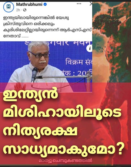 “ഇന്ത്യയിലായിരുന്നുവെങ്കില് യേശുക്രിസ്തുവിനെ ഒരിക്കലും കുരിശിലേറ്റില്ലായിരുന്നു” എന്ന അഭിപ്രായം പ്രകടിപ്പിച്ചത് ആര്.എസ്.എസ് നേതാവും സംഘടനയുടെ ജോയിന്റ് ജനറല് സെക്രട്ടറിയുമായ മന്മോഹന് വൈദ്യയാണ്. ജയ്പ്പൂര് ലിറ്ററേച്ചര് ഫെസ്റ്റിവലിലെ പാനല് ചര്ച്ചയിലാണ് അദ്ദേഹം ഇപ്രകാരം പറഞ്ഞതെന്ന് മാധ്യമങ്ങള് റിപ്പോര്ട്ടു ചെയ്യുന്നു (മാതൃഭൂമി ഓണ്ലൈന്, ഫെബ്ര 6, 2024).