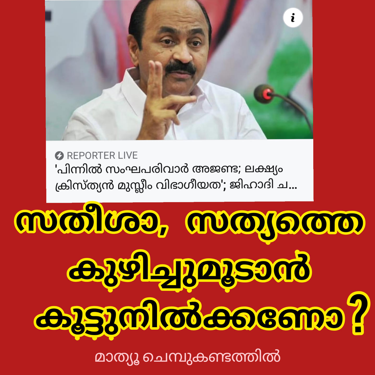 ആകാശംമുട്ടെ അധികാരമുണ്ടെന്ന ഭാവത്തോടെ എല്ലായിടത്തും കയറി അഭിപ്രായം പറയാനുള്ള വ്യഗ്രതയിലാണ് പ്രതിപക്ഷ നേതാവ് വി.ഡി സതീശന്‍. “ഞണ്ടിന് കാര്യസ്ഥന്‍റെ ഉദ്യോഗം കിട്ടിയതുപോലെ” മുന്‍പിന്‍ നോക്കാതെ വശങ്ങളിലേക്ക് മാത്രമുള്ള സഞ്ചാരിയാണ് താനെന്ന് അദ്ദേഹം പലപ്പോഴും തെളിയിച്ചിട്ടുണ്ട്. സംവരണവിഷയത്തില്‍ ക്രൈസ്തവസമൂഹത്തിനെതിരേ സതീശന്‍ എടുത്ത നിലപാടെന്തെന്ന് എല്ലാവര്‍ക്കുമറിയാം. ഇപ്പോളിതാ നാര്‍ക്കോട്ടിക്, ലൗജീഹാദ് വിഷയത്തിലും സതീശന്‍ വശങ്ങളിലേക്ക് മാത്രം നിരങ്ങാനുള്ള തന്‍റെ സഹജാവബോധം വെളിപ്പെടുത്തിയിരിക്കുന്നു. പാലാ ബിഷപ്പ് മാര്‍ കല്ലറങ്ങാട്ടില്‍ തന്‍റെ സഭയിലെ വിശ്വാസികളെ പ്രബോധിപ്പിച്ചത് “സംഘപരിവാര്‍ അജണ്ടയുടെ ഭാഗമാണെന്നാണ് ” ഈ മാന്യന്‍റെ കണ്ടെത്തല്‍. നിയമസഭയല്ല ക്രൈസ്തവസഭ എന്നു തിരിച്ചറിയാനുള്ള മിനിമം ബോധമെങ്കിലും സതീശന്‍ കാണിക്കേണ്ടതുണ്ട്. കേരളത്തിലെ കോണ്‍ഗ്രസിന്‍റെ വര്‍ത്തമാനകാല മുഖമായിരിക്കുന്ന ശ്രീ വി.ഡി സതീശന്‍ ആ കസേരയില്‍ ആയുഷ്കാലം വാഴട്ടെ എന്ന് ആശംസിക്കുന്നു. കോണ്‍ഗ്രസ് പ്രസ്ഥാനത്തിന്‍റെ കട്ടയും പടവും മടക്കാന്‍ ഈ മാന്യദേഹം ആ കസേരയില്‍ ഉണ്ടായാല്‍ മാത്രം മതി.