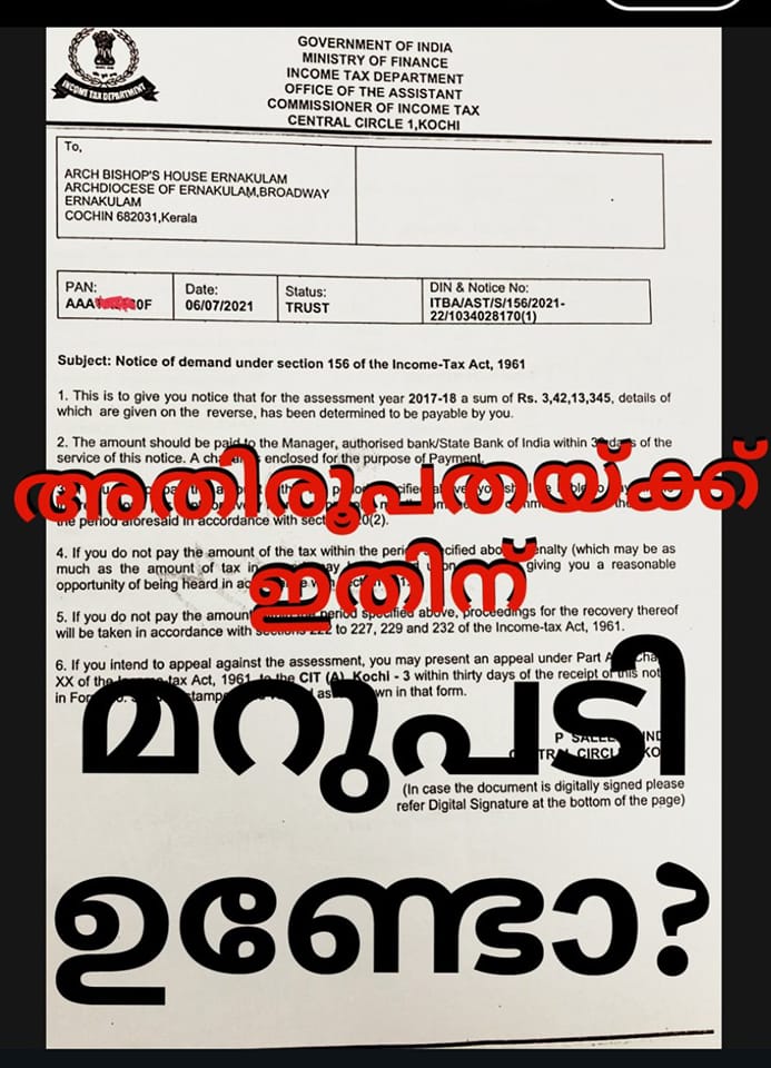 ഇൻകം ടാക്സ് ഡിപ്പാർട്ട്മെന്റിൽ നിന്ന് 6-7-2021-നാണ് (തീയ്യതിയും വർഷവും ശ്രദ്ധിക്കുക) അതിരൂപതക്ക് “tax” അടക്കുവാനുള്ള Demand Notice ലഭിക്കുന്നത്. 2017 ഏപ്രിൽ ഒന്ന് മുതൽ 2018 മാർച്ച് 31വരെയുള്ള സാമ്പത്തിക വർഷത്തിൽ 3,42,13,345/- രൂപ TAX അടക്കുവാനാണ് ഈ നോട്ടീസ് ആവശ്യപ്പെടുന്നത്. ഇതിൻ്റെ നാലാമത്തെ ഖണ്ഡികയിൽ, ഈ തുക അടച്ചില്ലെങ്കിൽ പിഴ അടക്കേണ്ടതായി വരുമെന്നും പറയുന്നുണ്ട്. ആറാമത്തെ ഖണ്ഡികയിൽ, ഇതിൽ എതിർപ്പുകളുണ്ടെങ്കിൽ ഒരു മാസത്തിനകം അപ്പീൽ നൽകാവുന്നതാണെ എന്നും വ്യക്തമാക്കിയിരിക്കുന്നു.