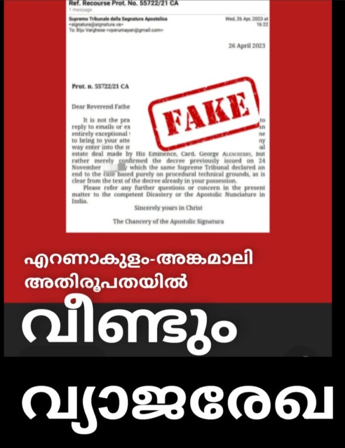 എറണാകുളം-അങ്കമാലി അതിരൂപതയിൽ വീണ്ടും വ്യാജരേഖയെ സംബന്ധിച്ച വിവാദം. വത്തിക്കാനിലെ പരമോന്നത കോടതിയായ അപ്പസ്ത്തോലിക് സിഞ്ഞത്തൂരയുടേത് എന്ന് തോന്നിക്കുന്ന ഇമെയിൽ ഐഡിയിൽ നിന്ന് ഫാ. വർഗീസ് പെരുമായാന് ഏപ്രിൽ 26-ന് അയച്ചതായി കാണുന്ന ഇമെയിലാണ് വിവാദത്തിന് അടിസ്ഥാനം. ഇത് യഥാർത്ഥത്തിൽ ഉള്ള ഇമെയിലാണോ അതോ ആരെങ്കിലും വ്യാജമായി നിർമ്മിച്ചതാണോ എന്നുള്ളതാണ് കണ്ടുപിടിക്കേണ്ട വസ്തുത.